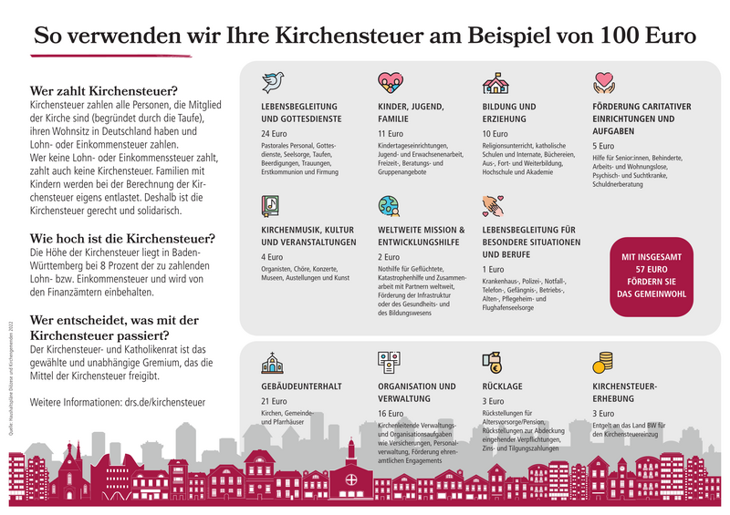 Das Geld aus der Kirchensteuer hilft Menschen beim Leben, gibt Arbeit, fördert das Ehrenamt, ermöglicht Bildung und Erziehung, unterstützt Einrichtungen und Projekte der Caritas, schafft Kultur und bietet einen verlässlichen Rahmen, in dem Katholikinnen und Katholiken ihren Glauben leben können.